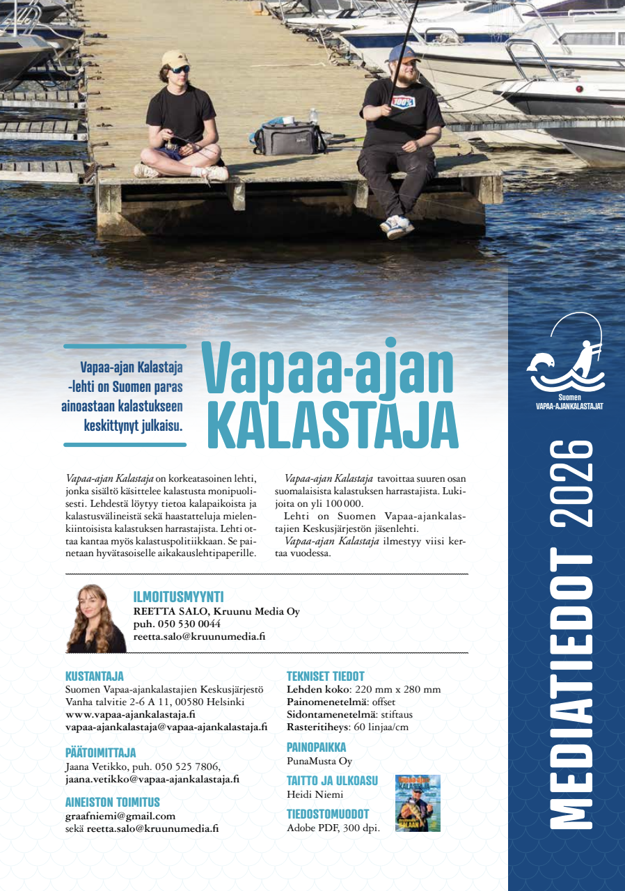 Minulla on ilo ilmoittaa uudesta yhteistyöstä: olemme aloittaneet Vapaa-ajan Kalastaja -lehden ulkoistettuna mediamyyjänä! Tämä merkitsee meille mahdollisuutta palvella entistä laajempaa asiakaskuntaa, jotka haluavat tavoittaa suomalaisia kalastajia ja siitä kiinnostuneita lukijoita!
